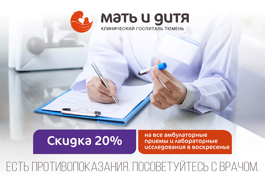 Скидка 20% на все амбулаторные приемы и лабораторные исследования (кроме молекулярной и генетической диагностики) всем пациентам в воскресенье.